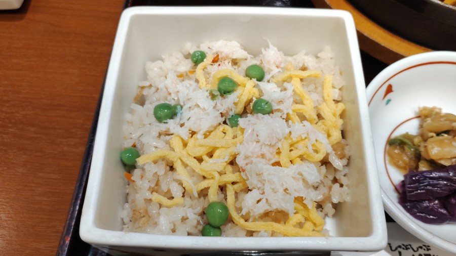 本来は白飯か十六穀米(オカワリ自由)ですが、300円でカニ御飯にチェンジ。