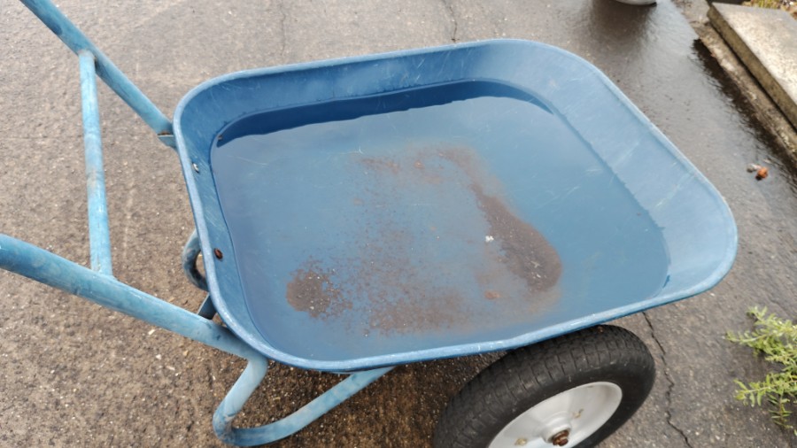 ・・・ソリャぁ、そーだよ、降水量をネコ車に溜まった水量で知る(笑)。