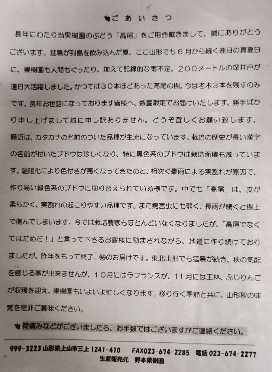 ↑昨日の東京で、とある事務所で打ち合わせをしておりましたら、その御相手には何度も宅配便がヤッてきたり電話が掛かってきたりと、チートモ肝心の打ち合わせが進まなかったんですが、「(どーせ雨模様だし)まぁアセるコトも無し」と悠然と構えておりましたところ、帰り掛けに「あ、ちょっと待って!」と先ほどの宅配便が届けてくれたと仰る葡萄を頂戴したんですが、ソレがこの「高尾」。ぶっちゃけ、人生中でサイコーの葡萄だと思いました。「ごあいさつ」状には生産者の御人柄が滲み出ていて微笑ましい。誠実さを見習わねばと感じ入りましたヨ。