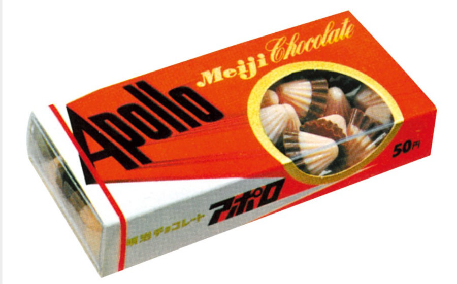 アレは、まだワタシが幼稚園の年長組さんだったころ、ナゼか「今日は半ドンね」と送迎バスやらで全員が自宅へ強制送還された日があったのを憶えておりまして、結局ソレは、『アポロ11号の月面着陸』を家に帰ってテレビで観ようってコトだったんですが、ソレっくらいに当時は世界の耳目を集めてたんです。アームストロング船長が月面に最初の一歩を踏み出すザラザラした質感の中継映像を、テレビに齧り付き固唾を呑んで観ていたのも懐かしい思い出であります。その直後に御菓子屋さんに並んだ『明治アポロチョコレート』は、サターンⅤ型の先端部分(司令船)を模した形状とスタイリッシュなパッケージが幼なゴコロには大いに刺さりまして・・・当時は幾らだったんだっけナァ、ちょっと高めで一箱30円ぐらいだったような・・・