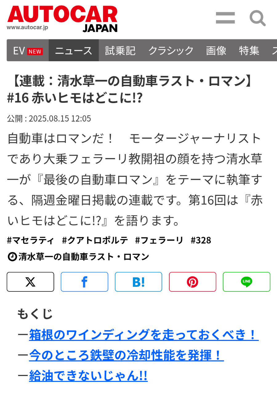 ここんところ、隔週連載となったAUTOCAR JAPAN誌サイトの連載「清水草一の自動車ラストロマン」なんですが、ワタシたちが、やれ“ダメ男の林間学校”だ、アチコチに小旅行だ、と、この酷暑の8月を謳歌していたスキ(笑)に、まぁコマを進められた様子でして・・・