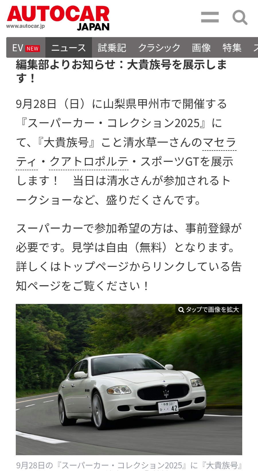 ↑とまぁ、「大貴族号」は、大乗フェラーリ教開祖様と「H井」編集長サンのお計らいに拠り、来る9月28日(日)に同誌(と甲府観光開発殿)主催で開催される「スーパーカー・コレクション2025in甲府城」なるイベントに展示されてしまう(ワタシにゃナンのコトワリも無く:笑泣)らしいっす。ううっ~、参加資格のページを拝見したところ、我がリモーネちゃん(ロータスヨーロッパスペシャル)はビミョーにOKみたいナンだけど、わざわざ“ロッソ恥(笑)”を掻きに行くこたぁ無かろうと・・・あ、車検切れてるんだったぁ!ヨカッタヨカッタ。