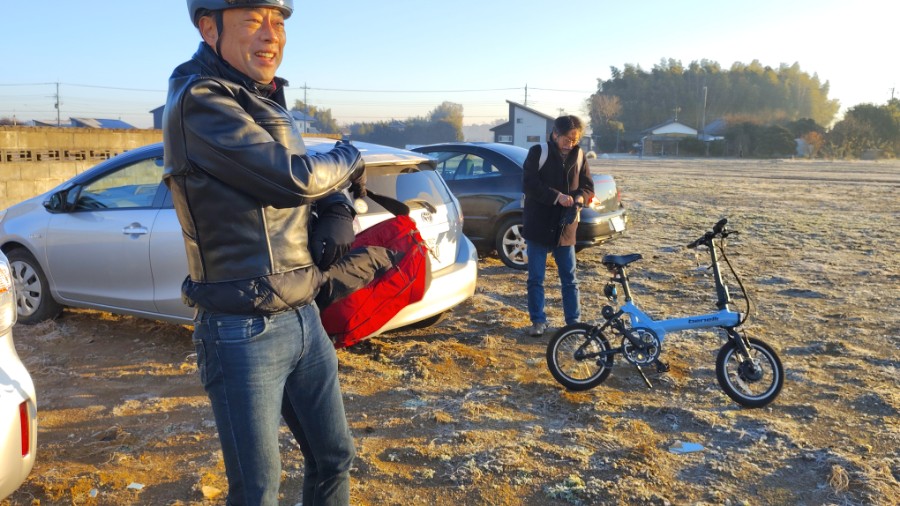 「町内会のM」御大は、ベネリの折り畳み電動チャリ。ちょっとズルい(笑)。