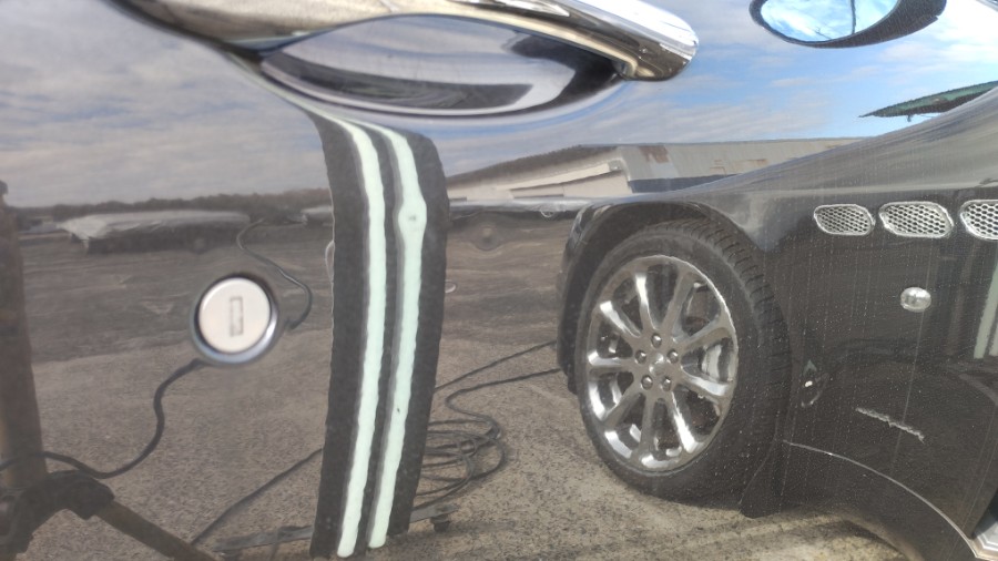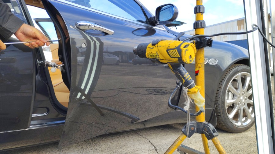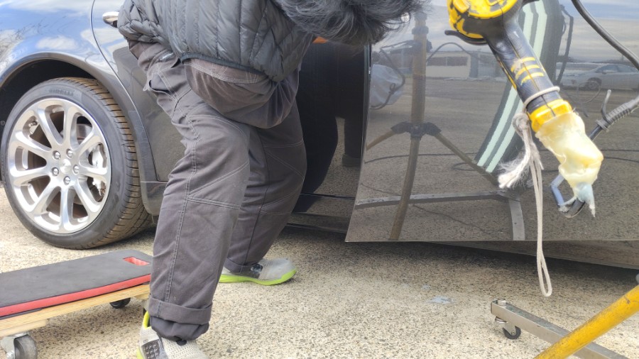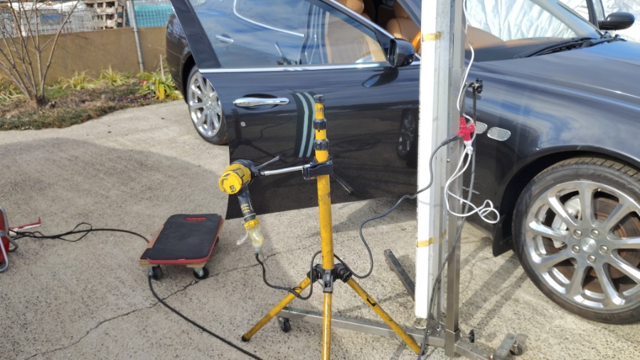 ・・・表面張力を整えるためにボディパネルをヒートガンで温めながらの作業。