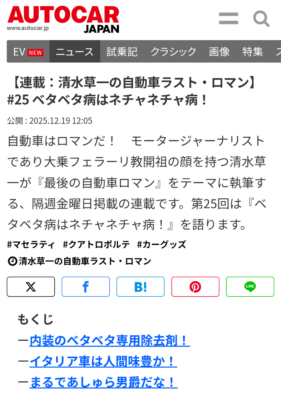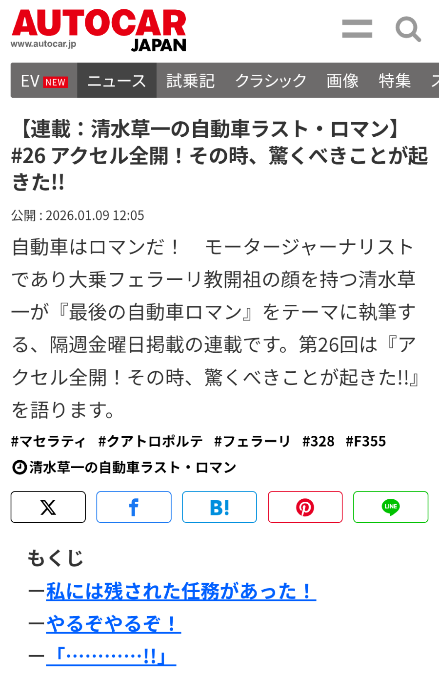 段々と連載記事の更新スパンが広がってきておりますが、相変わらずに『清水草一の自動車ラストロマン』は続いておりまして、本日は金曜日であるコトを忘れてたワタシも、夕方になって思い出し「今日はアップされてるよな?」と見てみたら、新年初の記事更新となってました。