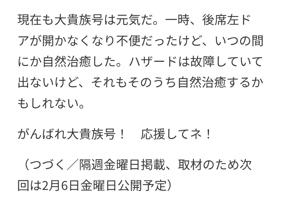 ↑あ~ヨカッタぁ、年を跨いでも『大貴族号』が健在で(笑)。『自動車ラストロマン』次の更新は、だいぶん先の2月6日(金)になっちゃうそーなんで、その間も元気にしておりますよう祈っておりますヨ。